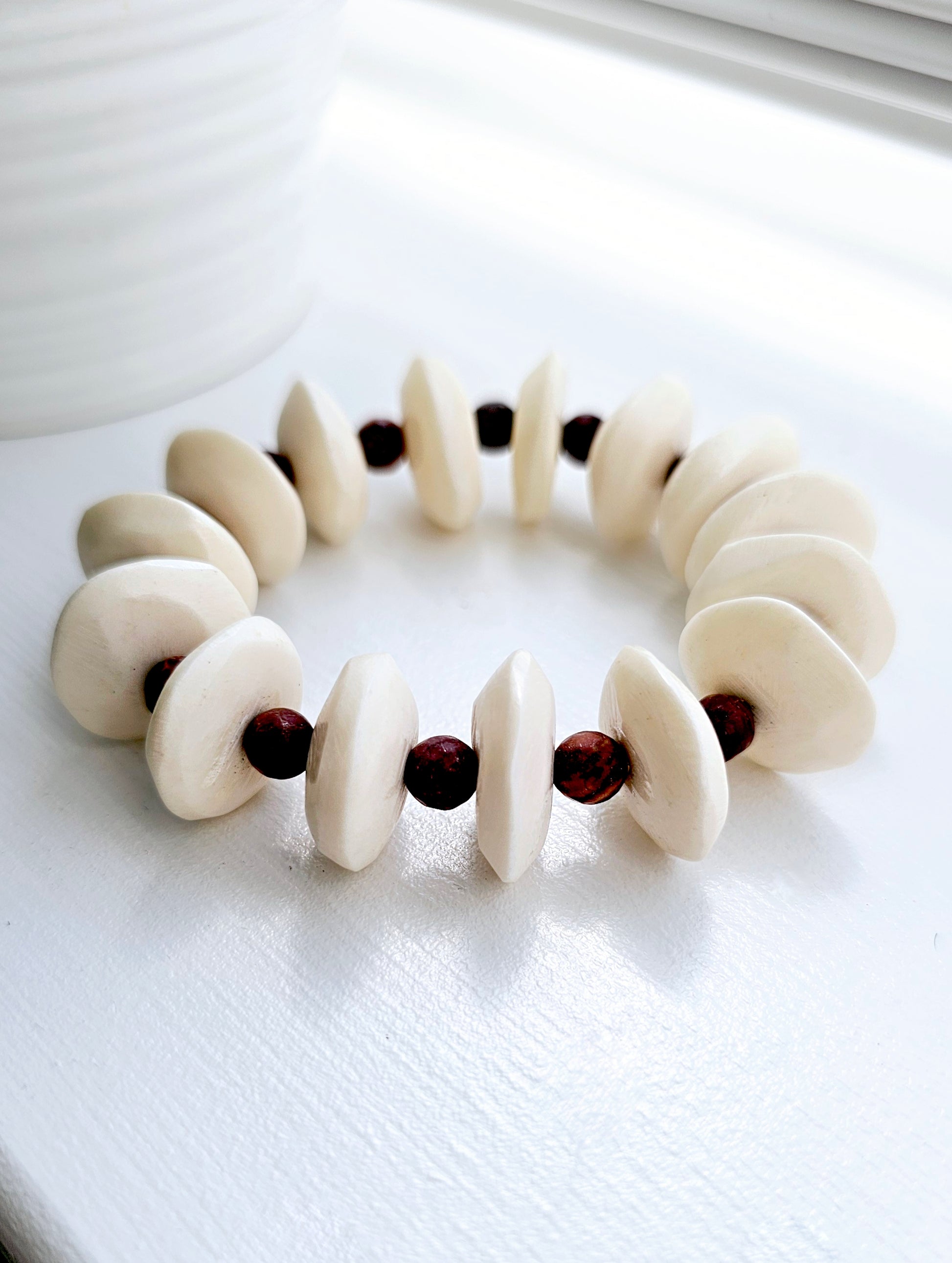 This bracelet represents life cycles throughout the lineage. Generations built upon generations, connections, peace, and love. Made with African bone beads and natural jasper beads known for it's healing energy.